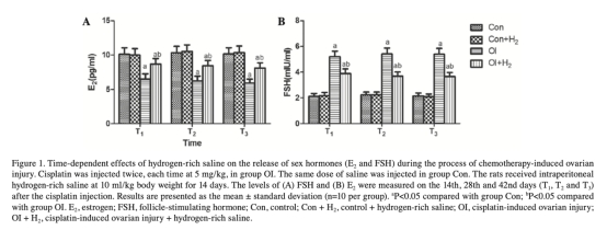 1. 性激素水平(E2和FSH):來自Figure 1。數據顯示順鉑損傷組(OI)FSH升高、E2降低,富氫鹽水處理(OI+H2)逆轉了這一變化。研究意義在于表明富氫鹽水能調節性激素平衡,減輕卵巢功能損傷,反映其保護作用。