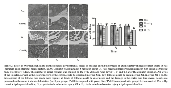 2. 卵泡計數和卵巢結構:來自Figure 2。數據顯示順鉑損傷組(OI)卵泡減少、皮質結構破壞,富氫鹽水處理(OI+H2)改善卵泡發育和保護組織。研究意義在于直接證明富氫鹽水能維持卵巢形態和功能,減少化療引起的卵泡損失。