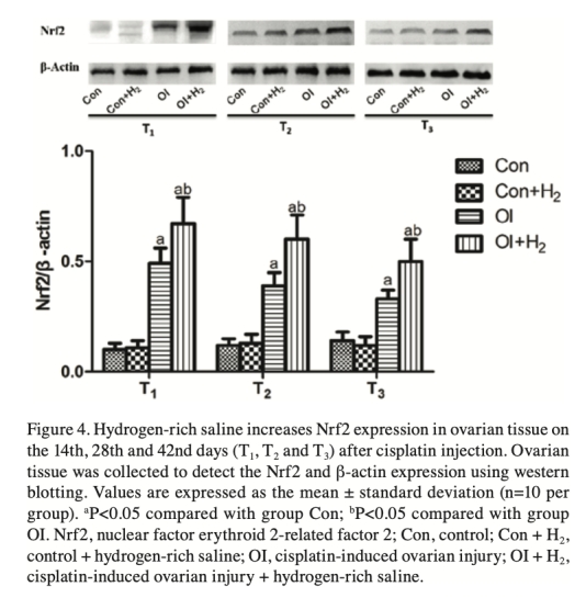 4. Nrf2蛋白表達:來自Figure 4。數據顯示順鉑損傷組(OI)Nrf2表達升高,富氫鹽水處理(OI+H2)進一步增加Nrf2。研究意義在于表明富氫鹽水可能通過激活Nrf2/ARE信號通路,增強細胞抗氧化反應,參與保護機制。