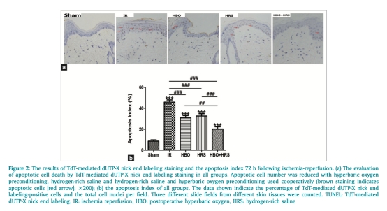 2. 凋亡指數評價:來自Figure 2。TUNEL染色顯示缺血/再灌注組凋亡指數最高(45.85±6.64%),高壓氧+富氫鹽水組最低(20.24±6.90%)。研究意義表明協同處理能有效抑制細胞凋亡,減少組織損傷。