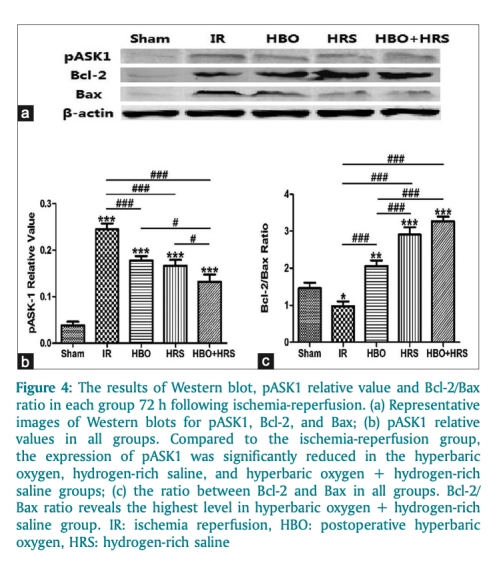 4. pASK1蛋白表達和Bcl-2/Bax比率:來自Figure 4。缺血/再灌注組pASK1表達最高(0.25±0.04),高壓氧+富氫鹽水組最低(0.13±0.05);Bcl-2/Bax比率在高壓氧+富氫鹽水組最高(3.27±0.42)。研究意義在于揭示協同處理調節凋亡通路關鍵蛋白,抑制ASK-1/JNK通路,促進抗凋亡因子。