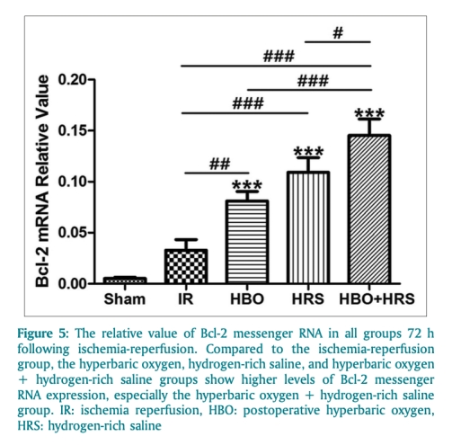 5. Bcl-2 mRNA表達:來自Figure 5。缺血/再灌注組Bcl-2 mRNA表達最低(0.03±0.03),高壓氧+富氫鹽水組最高(0.15±0.05)。研究意義在于從基因水平證實協同處理增強抗凋亡信號,提供分子機制證據。