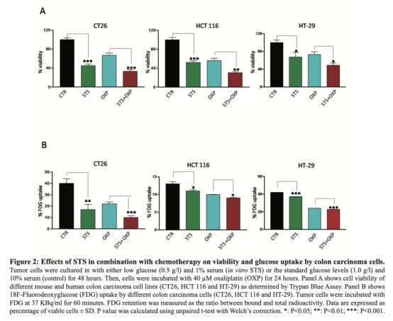2. 體外細胞活力和葡萄糖攝取數據:通過臺盼藍染色和FDG攝取實驗測量,顯示STS和OXP聯合處理降低細胞活力和葡萄糖攝取,研究意義是驗證STS在細胞水平直接誘導代謝抑制和化療增敏,數據來自圖2。
