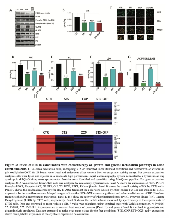 3. 代謝酶表達和活性數據:通過Western blot、酶活性測定和免疫熒光測量,顯示STS下調GLUT1、GLUT2、HKII、PFK、PK、LDH等糖酵解酶的表達和活性,研究意義是揭示STS逆轉瓦伯格效應的分子基礎,即抑制糖酵解通路,數據來自圖3。