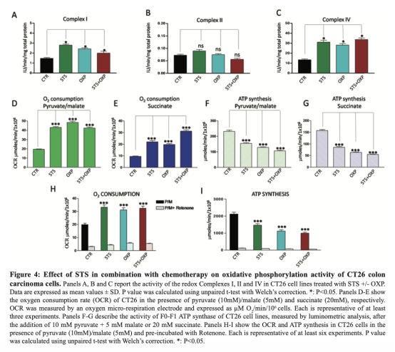 4. 線粒體氧化磷酸化數據:通過酶活性測定、氧消耗速率(OCR)和ATP合成測量,顯示STS增加復合物I和IV活性及OCR,但降低ATP合成,研究意義是證明STS引起呼吸鏈解偶聯,導致能量危機,數據來自圖4。