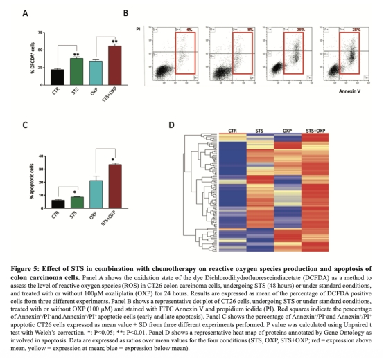 5. 活性氧(ROS)和凋亡數據:通過DCFDA染色和Annexin V/PI流式細胞術測量,顯示STS和OXP增加ROS產生和凋亡,研究意義是 linking代謝變化到細胞死亡機制,數據來自圖5。