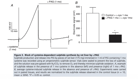 2 硫化氫釋放數(shù)據(jù):使用丹麥Unisense電極測量肝組織中半胱氨酸誘導(dǎo)的硫化氫釋放,評估PAG和DTT對釋放的影響。研究意義是直接驗證硫化氫合成阻斷劑在組織水平的效果,確認(rèn)PAG能抑制CSE介導(dǎo)的硫化氫生成。數(shù)據(jù)來自圖3和圖10C。