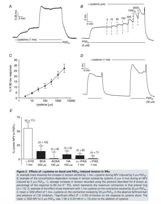 摘要部分闡述了研究評估了硫化氫(H2S)在低氧性肺血管收縮(HPV)中的作用。通過測試硫化氫前體半胱氨酸和硫化氫合成阻斷劑對HPV的影響,發(fā)現(xiàn)半胱氨酸能增強HPV和由前列腺素F2α(PGF2α)引起的正常氧血管收縮(NPV),但這些效應(yīng)被胱硫醚γ-裂解酶(CSE)阻斷劑炔丙基甘氨酸(PAG)所廢除。然而,在正常生理鹽水溶液(PSS)或含有生理濃度半胱氨酸、胱氨酸和谷氨酸的PSS中,PAG或天冬氨酸(CAT拮抗劑)不影響HPV,而二硫蘇糖醇(DTT)反而廢除HPV。研究還顯示PAG顯著減少半胱氨酸誘導(dǎo)的硫化氫釋放,但DTT不影響。結(jié)果表明不支持硫化氫在HPV中起作用的提議。