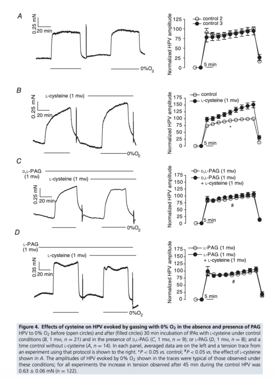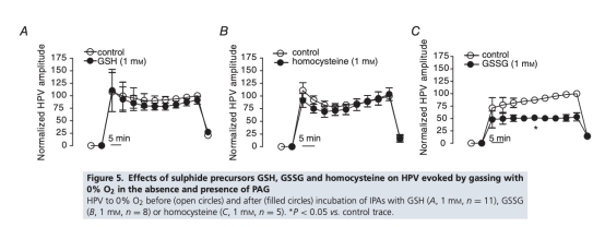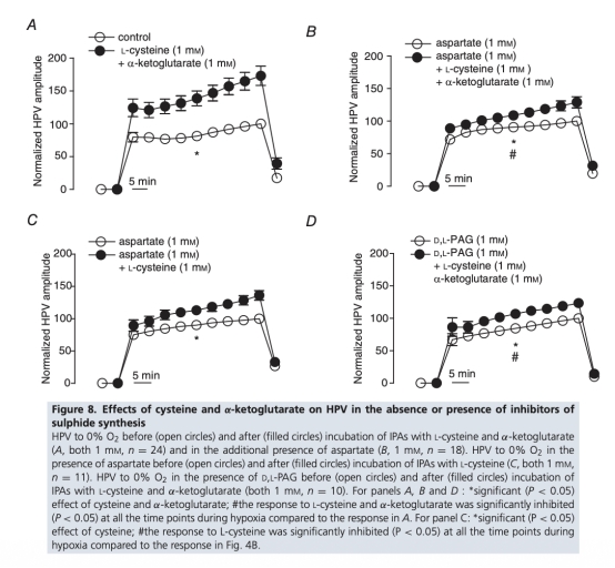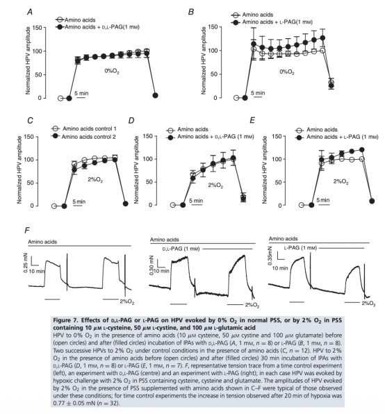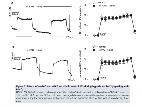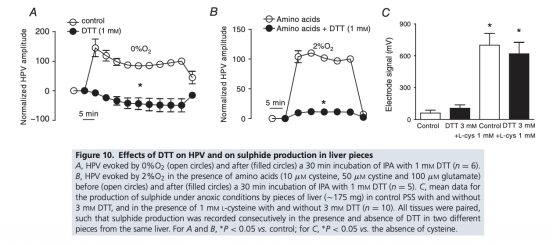 2 CAT拮抗劑天冬氨酸不影響HPV,且DTT廢除而非增強HPV,表明硫化氫由CSE或CAT/MST合成或從硫代硫酸鹽產(chǎn)生不太可能參與HPV的氧感應(yīng)。