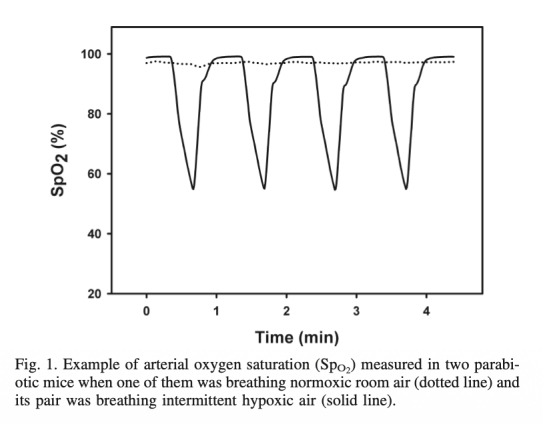 研究采用聯(lián)體共生手術(shù)將兩只小鼠皮膚和肌肉連接,建立交叉血液循環(huán)。術(shù)后2周,對一只聯(lián)體鼠施加缺氧挑戰(zhàn)(連續(xù)缺氧10% O2或間歇缺氧5% O2與21% O2交替),另一只呼吸常氧空氣,持續(xù)2小時。測量兩只動物的動脈血氧飽和度(SpO2)和肌肉組織氧分壓(Ptio2),并使用Evans blue染料驗證交叉循環(huán)有效性。通過比較兩組數(shù)據(jù),評估局部和系統(tǒng)效應(yīng)的分離。