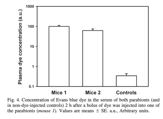 3. Evans blue染料濃度:數(shù)據(jù)來自圖4,注射染料后2小時,兩只聯(lián)體鼠血清中染料濃度無顯著差異。研究意義:證實交叉循環(huán)有效,血液因子可在聯(lián)體間共享,為系統(tǒng)效應(yīng)研究提供基礎(chǔ)。
