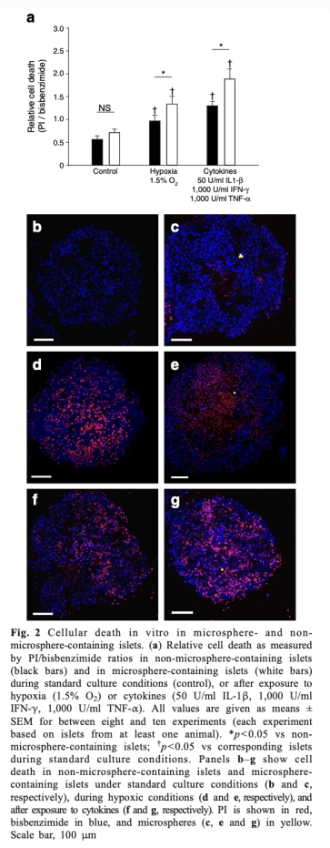 1 細胞死亡數據:測量體外標準培養、缺氧(1.5% O2)和細胞因子暴露下胰島的細胞死亡比例,通過PI和bisbenzimide染色計算。研究意義是驗證高灌注胰島對應激更敏感,提示其在移植早期更易死亡,數據來自Fig. 2。