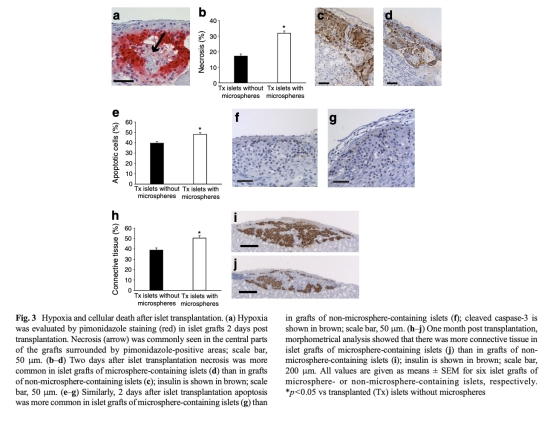 2 移植后早期死亡數據:測量移植后2天胰島 grafts 的凋亡(caspase-3染色)和壞死(形態學評估)比例。研究意義是顯示高灌注胰島移植后早期死亡更高,導致更多纖維化,數據來自Fig. 3。