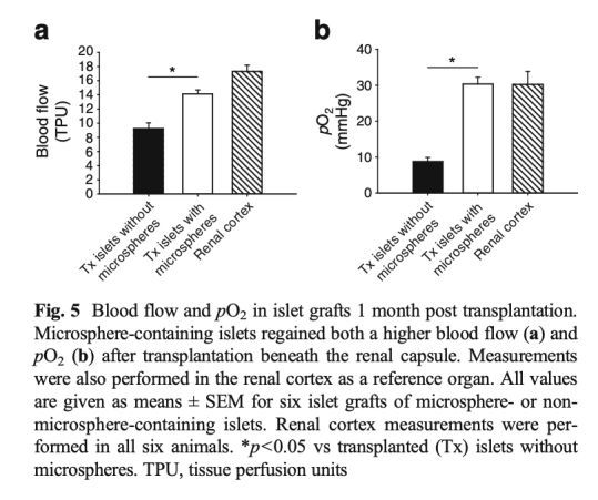 3 血管化數據:測量移植后1個月胰島 grafts 的血管密度(內皮細胞染色)、血流(激光多普勒)和氧分壓(pO2)。研究意義是證實高灌注胰島存活者再血管化能力更強,功能血管更多,數據來自Fig. 4和Fig. 5。