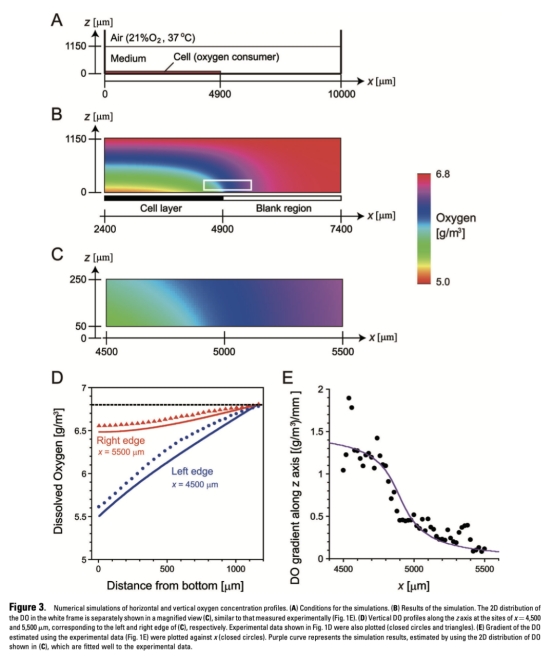 1 局部DO空間分布數(shù)據(jù):測量培養(yǎng)介質(zhì)中沿水平軸(x坐標)和垂直軸(z坐標)的DO剖面,顯示在細胞層區(qū)域DO變化顯著,而在無細胞區(qū)域DO恒定較高。研究意義是直接驗證局部氧消耗的異質(zhì)性,為理論模型提供實驗支持,數(shù)據(jù)來自圖2和圖3。