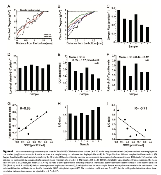 2 氧消耗率(OCR)估計數(shù)據(jù):基于垂直DO剖面計算hiPSC-CMs的OCR,平均值為0.55±0.17 pmol/h/細胞,并顯示OCR與心肌細胞比例正相關(guān)。研究意義是量化細胞代謝活性,有助于優(yōu)化培養(yǎng)條件,數(shù)據(jù)來自圖4。