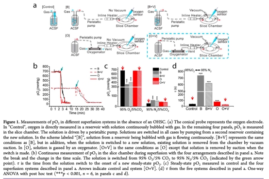 1. pO2在灌注系統(tǒng)中的變化:數(shù)據(jù)來自Figure 1。測量顯示,優(yōu)化系統(tǒng)[O+V]能快速(τ<30秒)實現(xiàn)pO2穩(wěn)態(tài)變化,而傳統(tǒng)系統(tǒng)響應(yīng)慢。研究意義:確保OGD/RP期間pO2變化時間尺度與體內(nèi)中風(fēng)模型一致,提高實驗的生理相關(guān)性,為實時監(jiān)測氧化還原動態(tài)提供可靠環(huán)境。