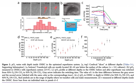 2. pO2隨組織深度的分布:數(shù)據(jù)來自Figure 2。在OHSCs中,pO2從表面(約691 mmHg)到中間(最低358 mmHg)變化,轉(zhuǎn)染細胞位于30-45μm深度,該范圍內(nèi)pO2變化一致且快速(τ約2分鐘)。研究意義:證實轉(zhuǎn)染區(qū)域pO2可控,確保氧化還原測量在均勻缺氧條件下進行,減少深度異質(zhì)性帶來的偏差。
