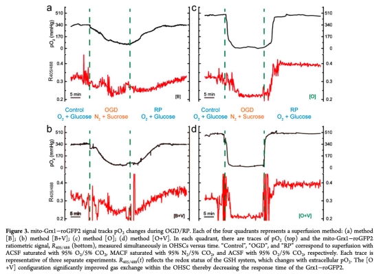 3. Grx1-roGFP2信號與pO2的同步變化:數(shù)據(jù)來自Figure 3。在OGD/RP期間,Grx1-roGFP2比率信號(R405/488)與pO2變化時間尺度一致,優(yōu)化系統(tǒng)[O+V]響應(yīng)最快。研究意義:驗證傳感器能實時反映氧化還原動態(tài),且系統(tǒng)優(yōu)化確保信號變化與生理過程同步,為研究GSH系統(tǒng)在缺血中的角色提供直接證據(jù)。