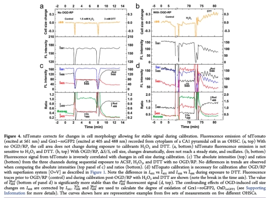 4. tdTomato內(nèi)標校準細胞形態(tài)變化:數(shù)據(jù)來自Figure 4。OGD/RP后校準期間,細胞大小變化顯著,tdTomato信號作為內(nèi)標校正Grx1-roGFP2絕對強度,使OxDroGFP2計算穩(wěn)定。研究意義:解決應(yīng)激條件下細胞體積變化對熒光信號的干擾,提高氧化還原參數(shù)定量的準確性,確保EGSH推導(dǎo)可靠。
