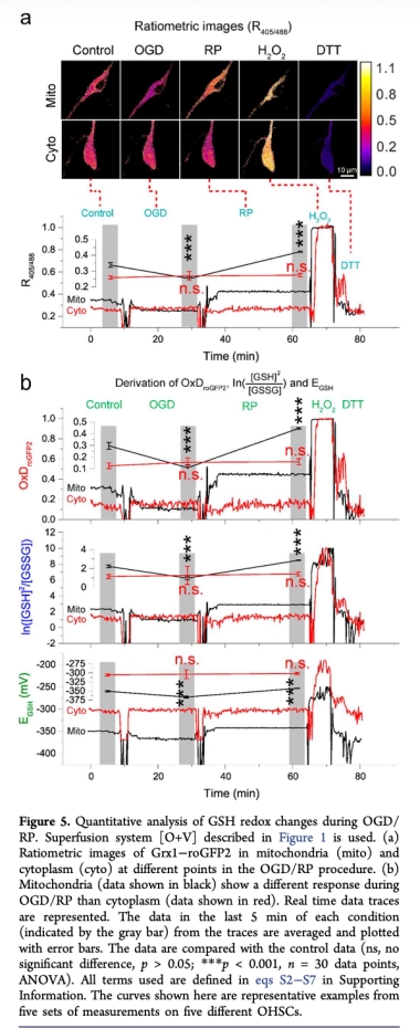 5. 線粒體和細胞質(zhì)GSH氧化還原變化:數(shù)據(jù)來自Figure 5。在線粒體中,OGD期間OxDroGFP2從0.30降至0.10(更還原),RP期間升至0.45(更氧化);細胞質(zhì)中無顯著變化。EGSH在線粒體OGD期間更負(-351 mV),RP期間更正。研究意義:揭示線粒體GSH系統(tǒng)在缺血應(yīng)激中動態(tài)變化更敏感,提示還原等效物供應(yīng)(如NADPH)可能主導(dǎo)氧化還原狀態(tài),而非ROS,為中風(fēng)機制提供新見解。