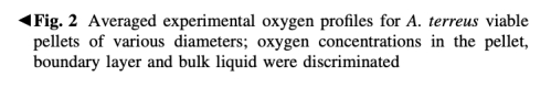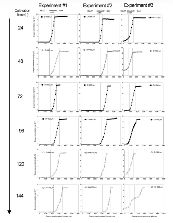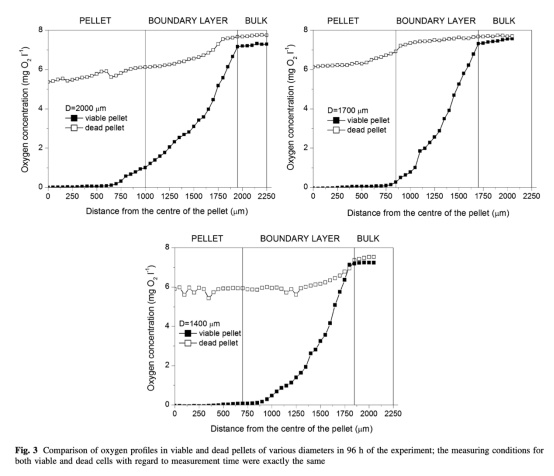 1. 氧濃度剖面數據:來自圖2、圖3和圖6。數據顯示菌絲球內部氧濃度隨深度增加而降低,小菌絲球(直徑1400微米)氧滲透更完全,而大菌絲球(直徑6200微米)內部氧濃度接近零。研究意義:直接證明氧擴散限制在菌絲球中心區(qū)域導致微氧環(huán)境,影響微生物代謝活性,為優(yōu)化菌絲球大小提供實驗依據。