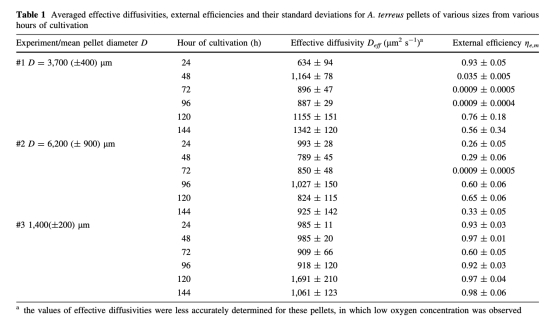 2. 有效擴散系數數據:來自表1。有效擴散系數值在643至1342微米2/秒之間,隨菌絲球大小和培養(yǎng)時間變化,小菌絲球和后期培養(yǎng)階段擴散系數較高。研究意義:量化氧在菌絲球內的擴散能力,揭示菌絲球結構(如密度和孔隙度)對傳質效率的影響,幫助理解形態(tài)工程在改善氧傳遞中的作用。