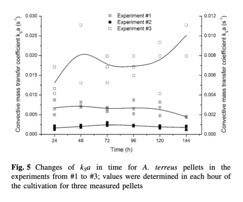 3. 外部傳質系數和效率數據:來自圖5和表1。外部傳質系數kS a隨菌絲球減小而增加,外部效率在氧充足時超過90%。研究意義:表明邊界層傳質限制在靜置條件下顯著,但在實際攪拌系統中可優(yōu)化,強調控制菌絲球大小和表面氧濃度對緩解傳質限制的重要性。
