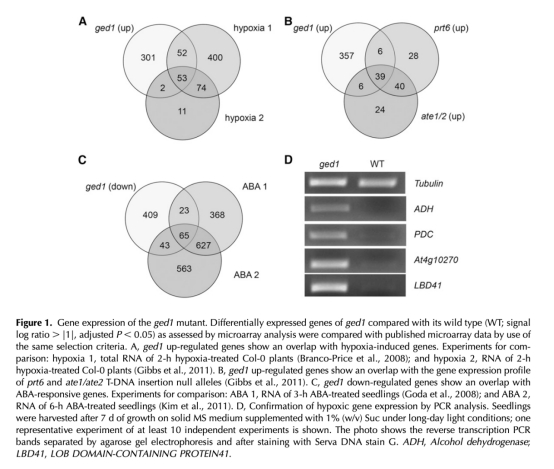 1 基因表達數據:通過微陣列和PCR分析ged1突變體與野生型的基因表達差異,顯示缺氧響應基因上調。數據來自圖1。研究意義是驗證N端規則途徑突變體是否組成性激活缺氧信號通路,從而解釋其脅迫耐受性。