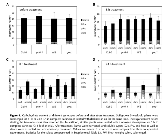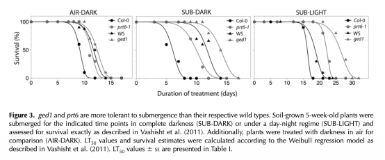 2 生存率數據:測量了植物在淹水黑暗、淹水光照和空氣黑暗條件下的生存時間,計算LT50值。數據來自圖3和表1。研究意義是評估prt6突變體在不同脅迫環境下的耐受性,并揭示生態型差異和恢復濕度對生存的影響。