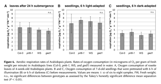 4 呼吸速率數據:使用氧電極測量幼苗和蓮座葉的氧消耗速率,評估有氧呼吸。數據來自圖6。研究意義是檢查突變體是否通過降低呼吸速率來保存能量,但結果顯示無顯著差異,提示其他適應機制。