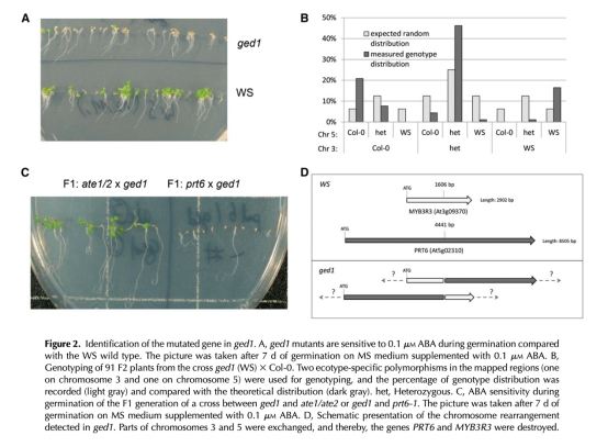 5 突變體鑒定數據:通過TAIL-PCR和測序確定ged1突變體涉及染色體交換。數據來自圖2。研究意義是揭示突變體遺傳基礎,確認PRT6基因功能喪失。