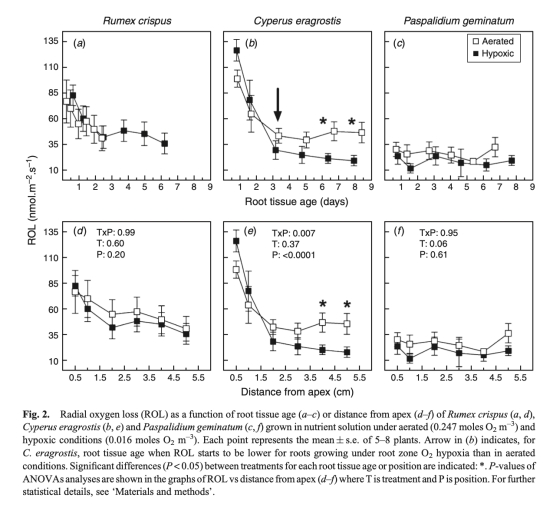 2 徑向氧損失(ROL):使用氧微電極在根表面和100μm距離測量氧濃度,計算ROL。研究意義是直接量化氧損失模式,揭示屏障有效性及其對低氧的響應。數據來自圖2。
