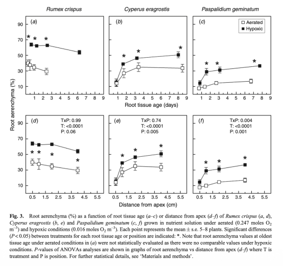 研究思路選擇三種耐淹草原物種(Rumex crispus、Cyperus eragrostis、Paspalidium geminatum),它們具有不同通氣組織類型(蜂窩狀、蛛網狀、自行車輪狀)。在水培實驗中,對植物施加通氣(0.247 moles O2 m-3)和低氧(0.016 moles O2 m-3)處理8天。測量新不定根的伸長率,并使用氧微電極測量ROL作為組織年齡和距根尖距離的函數。通過組織學分析定量通氣組織百分比和檢測外層皮層屏障(如木栓質和木質素沉積)。統計分析包括線性回歸、t檢驗和ANOVA,重點比較組織年齡而非固定位置的影響。