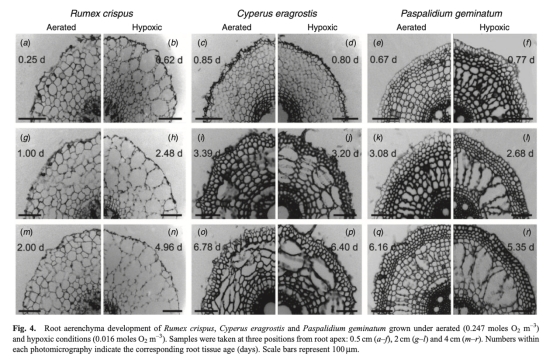 研究目的是調查根區低氧對根部通氣組織形成和徑向氧損失(ROL)屏障發展的影響,作為根組織年齡的函數,比較三種具有不同通氣組織類型的物種。旨在理解物種在低氧環境下如何通過調整解剖結構減少氧損失,并區分低氧直接效應和組織年齡的影響。