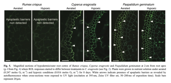 摘要闡述了植物根部通氣依賴于通氣組織和外層皮層屏障的形成,這些影響根向根際的徑向氧損失(ROL)。植物物種在這些響應中表現出巨大變異。研究調查了根區低氧對三種低地草原物種(各具不同通氣結構)的通氣組織形成和ROL屏障發展的影響,作為根組織年齡的函數。所有物種在低氧下增加根部通氣組織并繼續根伸長,但ROL屏障發展不同:Rumex crispus僅在老組織年齡顯示“部分”屏障,Cyperus eragrostis在低氧暴露后于3天以上組織啟動“更緊”屏障,Paspalidium geminatum在所有組織年齡下均顯示高效ROL抑制,與構成性“緊”屏障相關。低氧條件影響根伸長和屏障“緊度”,取決于物種。討論了不同ROL響應的生理意義。