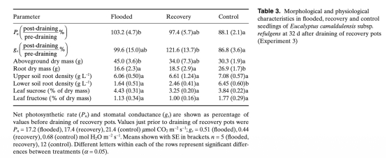 摘要闡述了研究人員調(diào)查了來自易發(fā)生強(qiáng)烈間歇性洪水旱地地區(qū)的河岸樹種Eucalyptus camaldulensis subsp. refulgens對洪水及恢復(fù)的生理和形態(tài)響應(yīng)。淹水88天的幼苗產(chǎn)生了大量不定根,表現(xiàn)出莖干肥大(莖直徑增加93%),并因通氣組織形成而增加了根系孔隙度。凈光合速率(Pn)和氣孔導(dǎo)度(gs)在土壤淹水至少2周內(nèi)得以維持,這與其他E. camaldulensis亞種的研究結(jié)果不同。隨后gs(比對照低30%)和Pn(比對照低19%)逐漸下降。淹水和對照植株的總?cè)~片可溶性糖沒有差異。洪水停止32天后根生物量沒有恢復(fù),但gs不低于對照,表明根系功能上能夠補(bǔ)償。然而,考慮到廣泛根系在旱地環(huán)境中的重要性,淹水后恢復(fù)期間有限的根系生長令人驚訝。結(jié)論是早期耐淹性可能是一種適應(yīng)策略,以利用水分有限環(huán)境中的稀缺水資源。