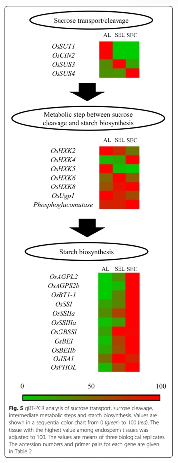 1 基因表達(dá)數(shù)據(jù):通過qRT-PCR測量蔗糖轉(zhuǎn)運(yùn)蛋白(如OsSUT1)、蔗糖裂解酶(如OsCIN2、OsSUS3、OsSUS4)、淀粉生物合成酶(如AGPL2、AGPS2b)等基因在糊粉層、側(cè)部淀粉胚乳和中心淀粉胚乳的表達(dá)水平。研究意義是揭示碳水化合物代謝基因的空間表達(dá)差異與淀粉積累異步性的關(guān)系,說明基因轉(zhuǎn)錄調(diào)控在胚乳發(fā)育中的作用。數(shù)據(jù)來自圖5和表2。