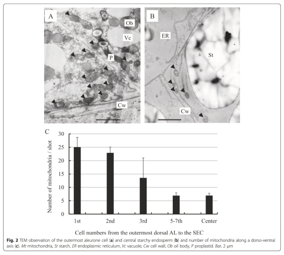 4 線粒體計(jì)數(shù)數(shù)據(jù):透射電鏡圖像定量糊粉層和淀粉胚乳的線粒體數(shù)量,顯示糊粉層線粒體密度顯著高于內(nèi)部胚乳。研究意義是直接證明糊粉層的高代謝活性,與有氧呼吸基因表達(dá)增強(qiáng)相符。數(shù)據(jù)來自圖2。
