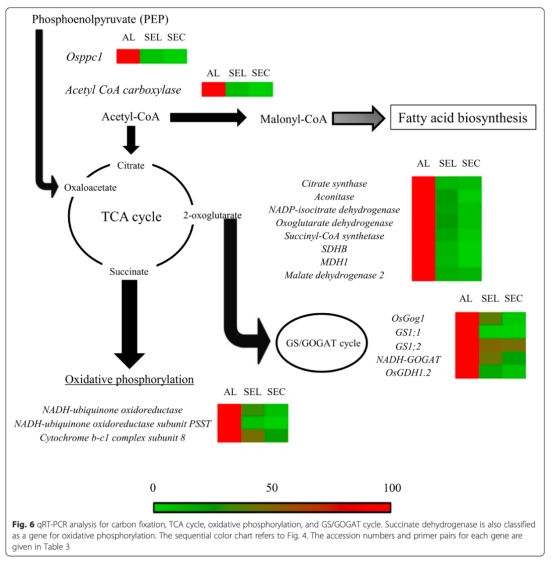 5 代謝途徑基因表達(dá)數(shù)據(jù):qRT-PCR分析TCA循環(huán)、氧化磷酸化、碳固定和GS/GOGAT循環(huán)相關(guān)基因的表達(dá),顯示糊粉層表達(dá)最高。研究意義是表明糊粉層通過有氧呼吸產(chǎn)生ATP,支持脂質(zhì)積累等過程。數(shù)據(jù)來自圖6和表3。