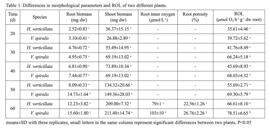 1 植物生長(zhǎng)參數(shù)和ROL:測(cè)量根生物量、地上部生物量、根內(nèi)氧濃度、根孔隙度和ROL速率。研究意義是評(píng)估植物生長(zhǎng)狀況和ROL能力,揭示植物對(duì)淹水環(huán)境的適應(yīng)策略。數(shù)據(jù)來自表1。