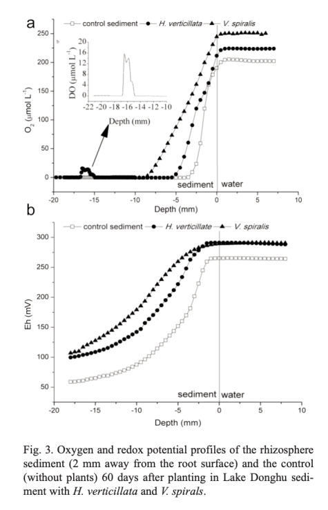 2 根際氧和Eh剖面:使用微電極測(cè)量根際沉積物的氧濃度和氧化還原電位(Eh)剖面。研究意義是量化根際氧化微環(huán)境的形成,驗(yàn)證ROL對(duì)沉積物氧化狀態(tài)的影響。數(shù)據(jù)來自圖3。