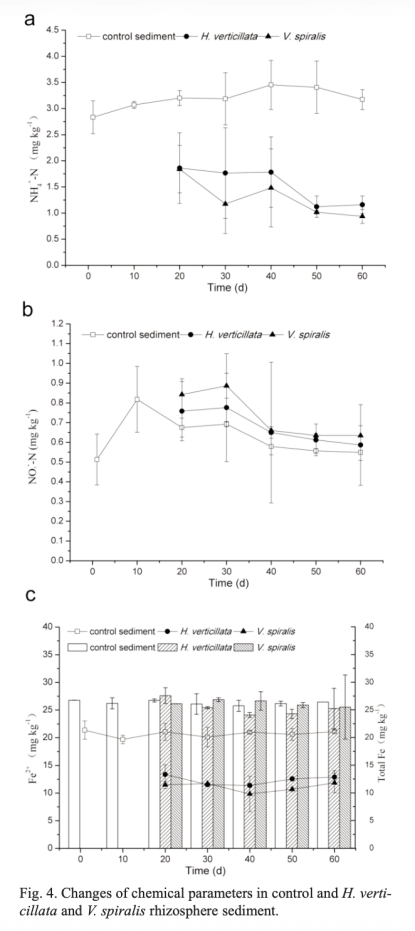 3 沉積物化學(xué)參數(shù):測(cè)量銨(NH4+)、硝酸鹽(NO3-)、總鐵和Fe2+濃度。研究意義是評(píng)估ROL對(duì)營(yíng)養(yǎng)鹽循環(huán)和氧化還原過程的影響,如促進(jìn)硝化和鐵氧化。數(shù)據(jù)來自圖4。