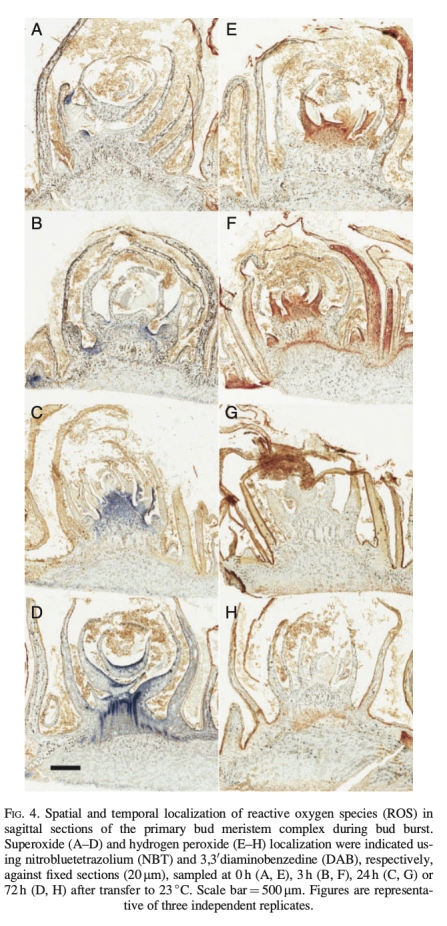 3. 超氧化物和過氧化氫積累:通過組織學方法檢測ROS的空間分布,數據來自圖4和圖5。研究意義:揭示ROS在分生組織和維管組織中的特異性積累,暗示其在細胞信號和發育調控中的角色。