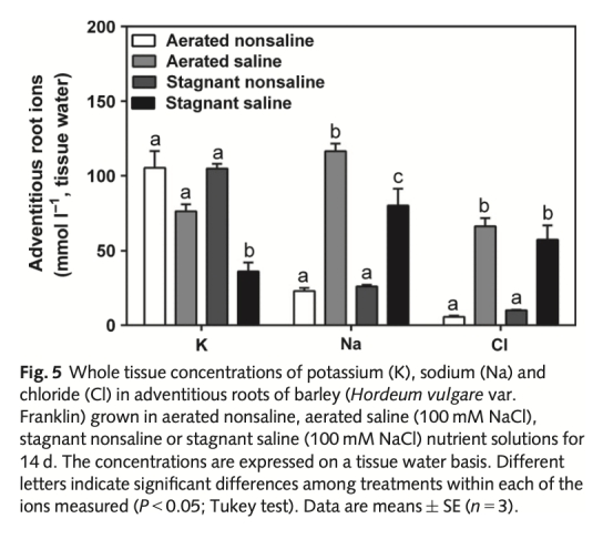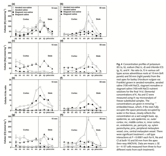 氧氣缺乏和鹽度影響大麥不定根中細(xì)胞特異性離子濃度