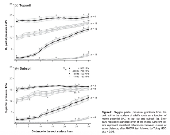 1. 氧分壓梯度:數據來自圖2,顯示不同基質電位下從 bulk soil 到根表面的氧分壓變化。研究意義:表明基質電位通過控制空氣填充孔隙度主導氧傳輸,水飽和條件下根表面氧分壓極低(0-3 kPa),而干燥條件下氧供應改善,界定根際氧效應范圍達10-25 mm,為理解土壤通氣性對根際有氧過程的影響提供定量證據。