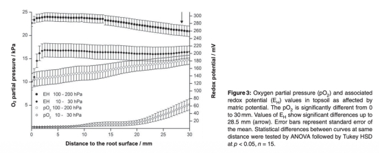 2. 氧化還原電位梯度:數據來自圖3,顯示不同基質電位下氧分壓和關聯的氧化還原電位值。研究意義:揭示氧化還原電位隨氧分壓下降而降低,水飽和條件下根表面氧化還原電位降至100 mV(弱還原狀態),而通氣條件下約300 mV,證實氧可用性驅動根際氧化還原狀態變化,梯度范圍僅0-2 mm,突顯根際作為微生物熱點的高空間異質性。