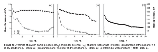 3. 氧和氧化還原電位動態:數據來自圖4,顯示根表面氧分壓和氧化還原電位隨時間的變化,如飽和事件后的響應。研究意義:表明氧化還原電位響應氧分壓變化有數小時延遲,短期飽和不影響氧化還原電位,但長期飽和導致中度還原條件,反映微生物呼吸模式轉換,對理解干濕循環下養分轉化和反硝化有啟示。