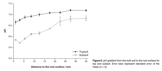 4. pH梯度:數據來自圖5,顯示從 bulk soil 到根表面的pH變化。研究意義:根誘導酸化使pH降低0.5-1單位,亞土壤酸化更強,歸因于土壤有機質緩沖能力差異,表明根際酸化影響養分有效性,梯度范圍達20 mm,強調根分泌物在空間調節中的作用。