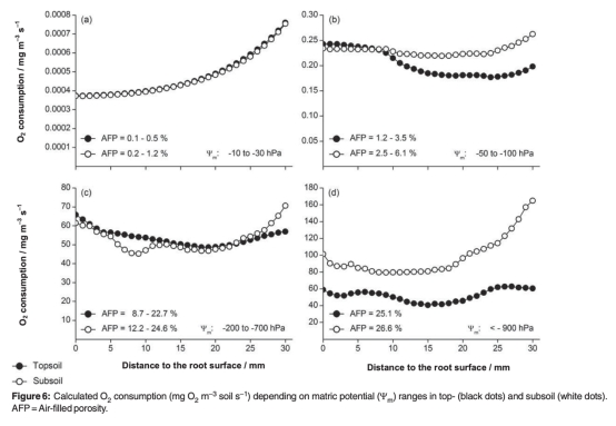 5. 氧消耗計算:數據來自圖6,顯示不同基質電位下計算的氧消耗率。研究意義:氧消耗隨干燥度增加而指數增長,基質電位低于-200 hPa時空氣填充孔隙度>9%使氧傳輸不受限,量化了呼吸活動對土壤濕度的依賴,為預測根際能量代謝提供參數。